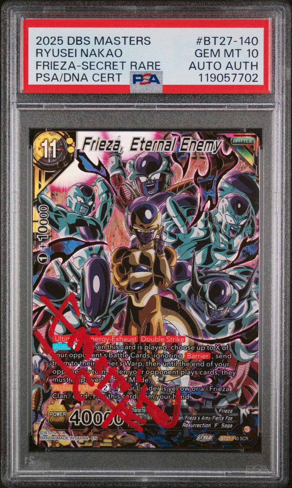 This stunning Secret Rare card features Frieza, Eternal Enemy from the Dragon Ball Super Masters set, beautifully signed by Ryusei Nakao, the legendary Japanese voice actor of Frieza. The card is graded a perfect GEM MINT 10 by PSA, ensuring pristine condition and exceptional eye appeal.